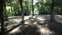 Uma figura toda coberta com uma fantasia se masturba no parque