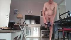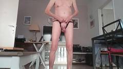Um velho gay a fazer um vídeo a solo usando as suas cuecas na câmara e mostrando aos fãs com a sua gaiola e provocando-se a si próprio ao vivo.
