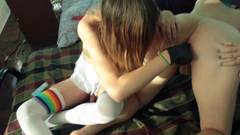 Duas trannies enfiam seus traseiros em um dildo de dupla face