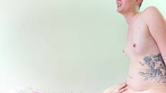 Duas jovens vagabundas trans, uma morena gorda e uma magra com mamas pequenas fodem apaixonadamente na cama, acariciam e enfiam seus dedos no rabo