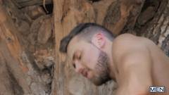 Cena de jardim de três gays bonitos e excitados chupando as piças um do outro e fodendo o traseiro um do outro. Colby Keller, Dato Foland e Logan Moore