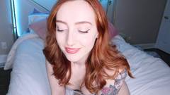 A jovem cabra está deitada de barriga para baixo, nua e com tesão, falando com seu namorado ao telefone e chupando um dildo como se fosse o pinto dele