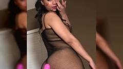 A morena gorda em meias-calças de rede de peixe se diverte com seu dildo rosa. Ela o empurra profundamente para dentro de sua cona molhada