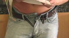 Um loiro musculoso começa o seu dia vendo pornografia e fica tão excitado com isso que tira a piça das calças e se masturba no balcão da cozinha até gozar.