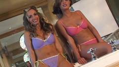 Duas lindas lésbicas entram em uma banheira para acariciar os peitos e os corpos nus perfeitos uma da outra.