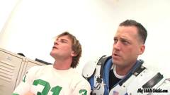 Um líder da claque fodida por dois jogadores em um ménage à trois