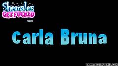 A travesti brasileira Carla Bruna e o cara se revezam chupando o pau um do outro. Ela é fodida e sodomiza o cara também, que ejacula em seus peitos.
