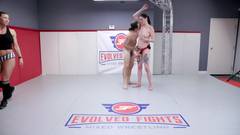 Aria Khaide e Tony Orlando lutam para foder um ao outro. No final, Aria fode o buraco de Tony com um strap-on.