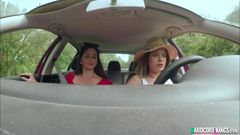 Duas bombons com tetas grandes Cathy Heaven e Alice Fabre com avaria no carro e Lutro as recolhe depois em sua casa as fode em trio com seu pau gordo