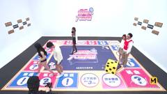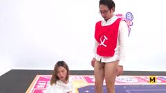 Uma garota asiática está jogando um jogo de tabuleiro com outras garotas e desenha um quadrado com um cara com o pênis para fora.