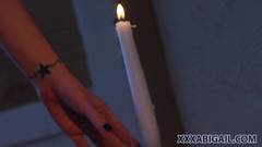 As duas mulheres fazem um delicioso joguinho uma com a outra, aplicando um pouco de cera nos corpos uma da outra antes de passar a língua na boceta