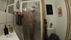 Um casal comum, uma mulher loira e seu homem tomam um banho juntos em um cubículo e a proximidade a excita tanto que ela começa a fazer um broche para ele.