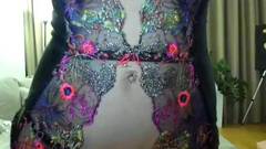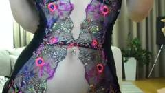 A loira com mamas grandes está vestida com lingerie sexy e meias pretas e nem presta atenção na câmera, masturbando-se apaixonadamente!