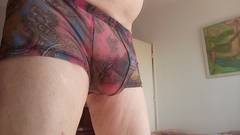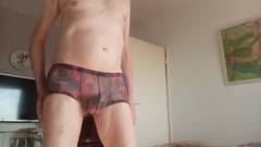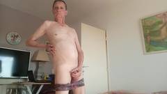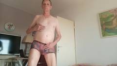 O velho pervertido tira a cueca e toca o pênis, começa a dançar e brinca com ele na frente da câmera, fazendo um show para seus fãs