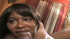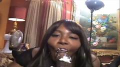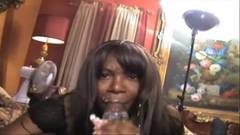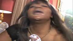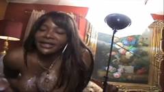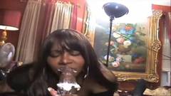 Uma transsexual negra gorda reveste seu pinto com creme e o chupa com grande prazer. As mamas com creme de leite excitam o cara, ele jorra no pinto dela