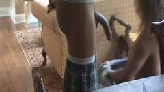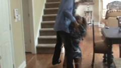 Ts Madison, trans negra gostosa fode em posições com um cara de máscara no chão e na escada. Elas estão com tanto tesão que não conseguem ir para a cama