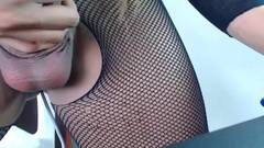 Esta trans fez um buraco especificamente na virilha de sua meia-calça de malha para tirar convenientemente sua piça e masturbar-se diante da câmera.