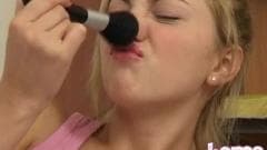 Depois de se maquiar, essa loira quer brincar um pouco... A cena de pornô soft de masturbação feminina para um adolescente safada.