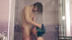 A Leruna Maeve, de cabelos azuis, se masturba com seu namorado no chuveiro, onde ela chupa o pau dele e o fode em diferentes posições!