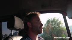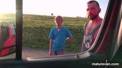 Um pai excitado e seu enteado se juntam a uma mulher excitada na van, deixando ela chupar os seus pintos e foder com ela dentro de uma van em andamento.