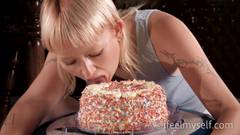 Essa loira safada comprou um bolo para tentar masturbar sua buceta sentada nele! Ela vai ficar louca e com muito tesão!