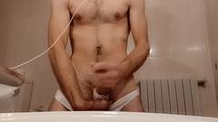 Eu me masturbo vigorosamente com a escravidão e a torção do pênis, vestida apenas com calcinha encimada por uma ejaculação