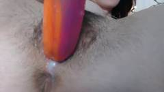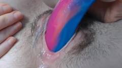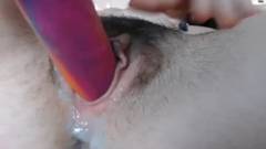 A cona peluda da amadora recebe um tratamento especial! Para ser penetrada por um dildo colorido, ficando muito molhada e quente!