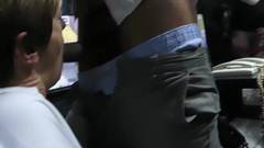 Ela se oferece na sex shop: chupa piças com a boca cheia e pega piças com a boceta para se encher.