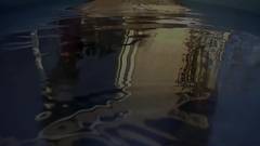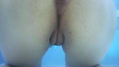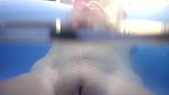 Ela relaxa na piscina, nua, para que os vizinhos possam ver sua bunda, sua buceta e seus peitos grandes.