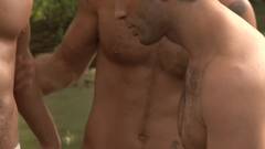 No rio Jordão, Jay Roberts e Bruno Jones se beijam quando seu esperma acaba no rosto de Sasha Dov com sua espessa liberação.