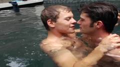 os hunks Jason Crew e Issac Conn fodem junto ao terraço da piscina e terminam com um espesso jizz cremoso.