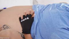 Caitlin Bell provoca o rapaz com seus seios grandes moldados em seu uniforme. Ela o fode com carinho na cama e o faz ejacular em seus seios grandes.