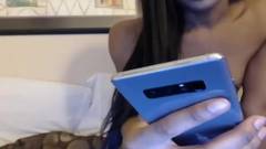 Uma linda travesti morena com peitinhos pequenos recebe um pedido do namorado. Ela bate uma punheta e mostra o pau para ele pelo telefone!