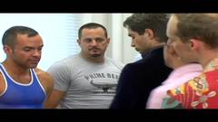 Jonathan Vargas e Jason Ridge chupam as piças grandes um do outro, fodem em flip-flop e usam um dildo preto duplo para se ejacular.