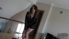 A jovem quer festejar, ela é muito sexy com seu fato de couro, ela o removerá para revelar seu corpo nu, então ela mesma se masturba comum dildo.