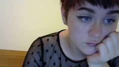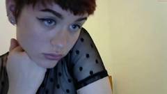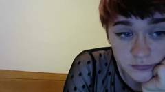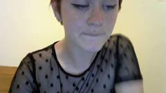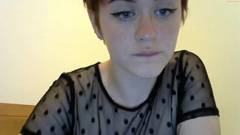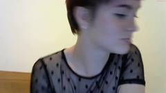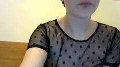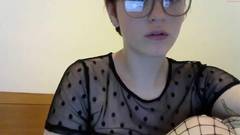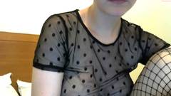 Uma garota amadora com cabelo curto e peitos grandes usa uma camiseta transparente e meias arrastão pretas enquanto toca sua buceta.