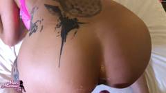 Entre duas sessões de bombadas fortes, essa MILF negra e gulosa, tem sua buceta e seu cuzinho fodidos no estilo cachorrinho.