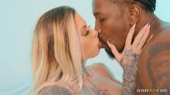 A loira tatuada adora o pau grande do cara negro, ela vai bombear nele antes de ter sua buceta desmontada, ela tem peitos enormes