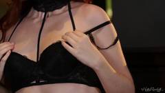 A bela Maya Kendrick está em um traje clássico, linda em lingerie preta, despindo seu corpo e se acariciando gentilmente para ficar excitada.