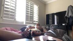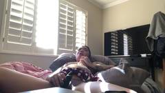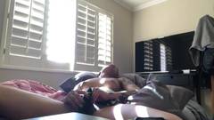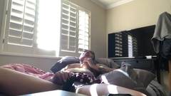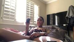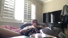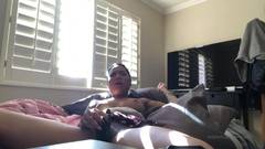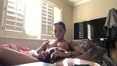 Essa linda garota de ébano, toda tatuada, liga sua webcam e se despe enquanto se equipa com seu brinquedo sexual para se masturbar e gozar