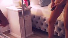 Essa boazona exibe seus peitos enormes, dedilha a buceta com um vibrador e se masturba com os golpes do vibrador.