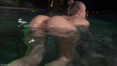 Uma linda modelo loira saindo da piscina em seu traje de banho, fazendo um show para nós, onde ela lentamente fica nua e brinca consigo mesma.