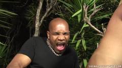 A transexual Michelle Charme tem seu cu dilacerado por um grande pau preto ao ar livre e engole todo o seu esperma!
