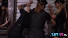 As policiais gostosas trans transam com um homem e o fazem chupar suas picas grandes nesse vídeo de gangbang!
