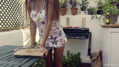 Churrasco de verão nua com a sensual Gloria Sol, uma linda morena com uma buceta peluda que nos mostra como seu corpo é apertado!