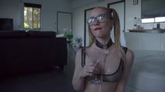 A bela Scarlet, com uma coleira no pescoço, acaricia a si mesma por um longo tempo, depois faz um boquete inesquecível antes de saborear o esperma