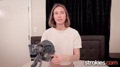A doce e nerd Claire Roos leva suas habilidades com as mãos para Strokies, compartilhando histórias sujas de sexo anal na câmera.