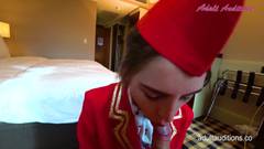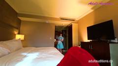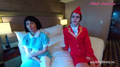 Para o casting, duas garotas se disfarçam de garçonete e hostess para fazer um ménage à trois.