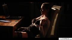 Stacy transa com seu colega debaixo da mesa no meio de uma reunião de negócios e se imagina oferecendo-se a ele em lingerie fina na cadeira do escritório.