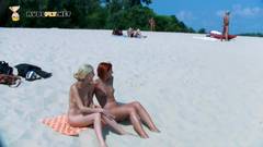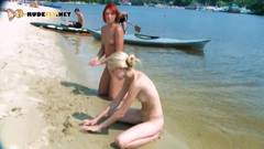 Garotas de corpo esbelto aproveitam o sol em uma praia de nudismo